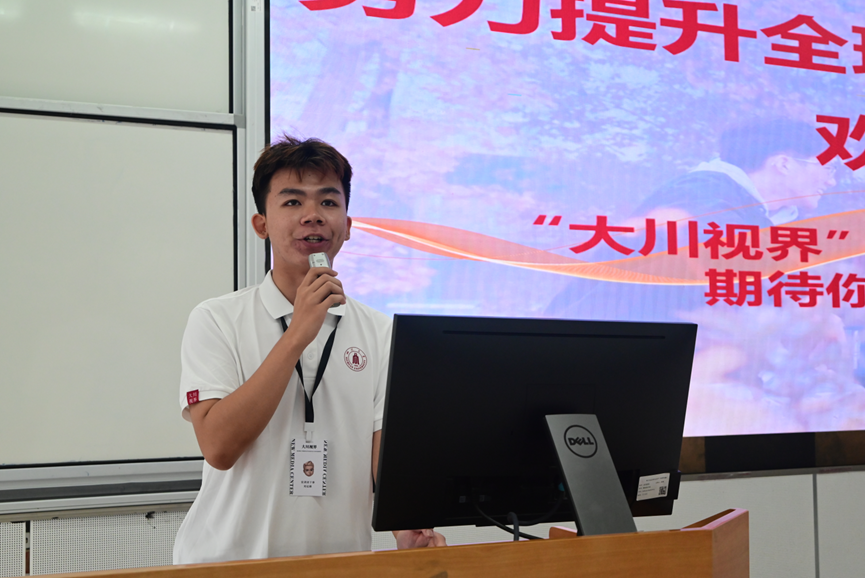学工部“大川视界”项目宣讲团学长向新生介绍了学校丰富的国际交流资源。他通过生动案例分享了短期访学、海外名校暑期课程、国际联合培养等项目的参与体验,强调“大川视界”对拓展全球视野、提升跨文化沟通能力的重要作用。小导师鼓励新生提前规划语言学习,积极关注国际处和学院发布的项目通知,主动争取机会“走出去”,在实践中深化对专业知识的理解,培养国际化竞争力。