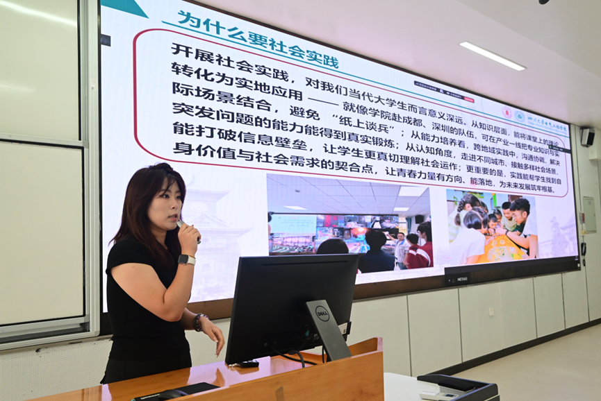 团委学生会主席团成员田怡楠、马镜茹向新生系统介绍了第二课堂与社会实践的相关内容。她们以2025年暑期学院19支实践队、300余名学生奔赴全国多地开展的实践活动为例,生动展示了社会实践不仅是“走出书本、走进现实”的行动,更是连接专业知识与社会需求的重要桥梁。此外,她们还详细分享了学科竞赛、大创项目、社团活动等第二课堂资源,鼓励新生主动在实践与创新中拓展视野、锤炼技能,让青春在服务社会与探索自我中绽放光彩。