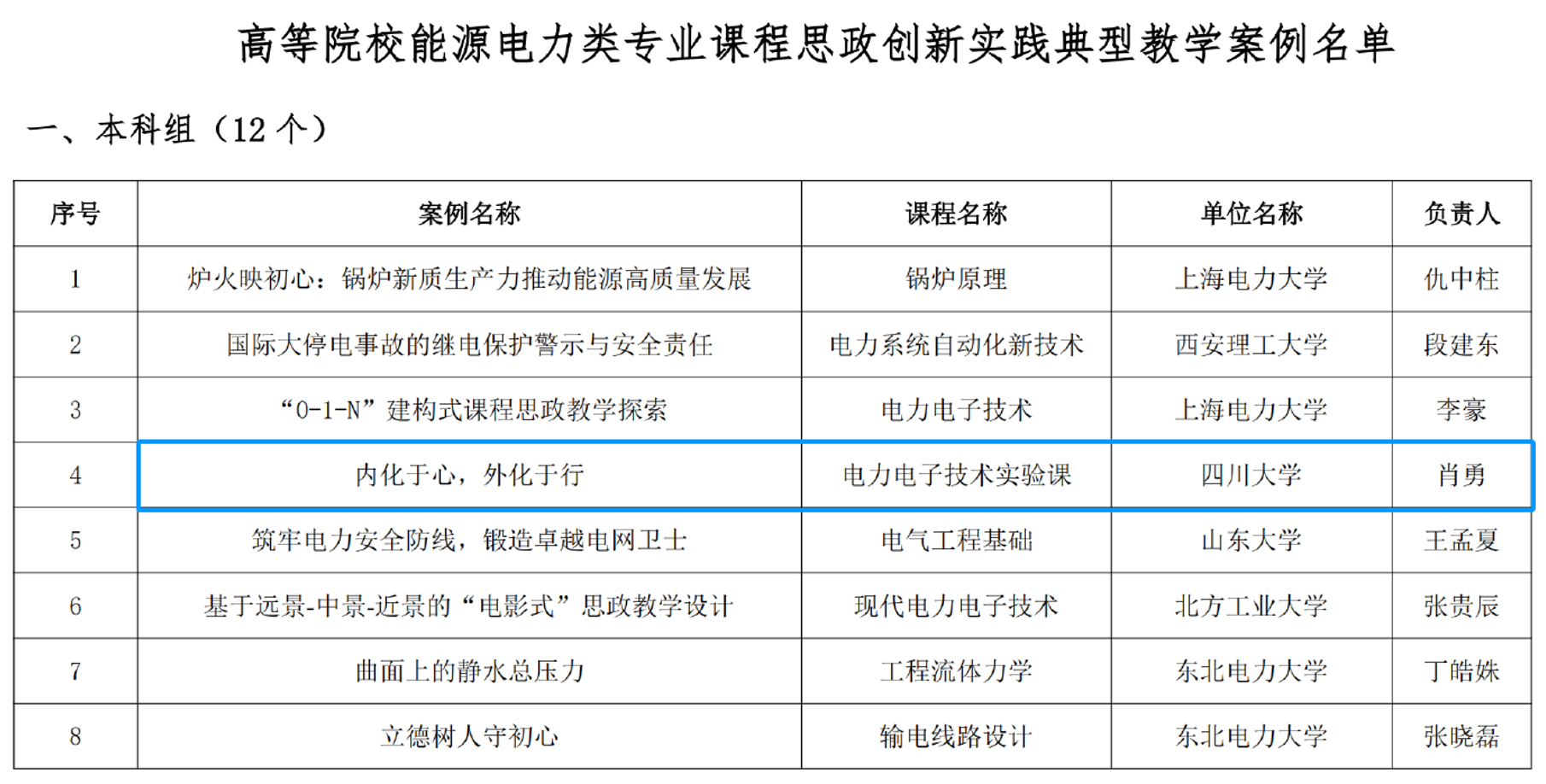 肖勇老师负责讲授的《电力电子技术实验课》,从全国38所高校申报的能源电力类专业课程思政创新实践案例中脱颖而出,被中国电力教育协会认定为能源电力类专业课程思政创新实践典型教学案例。这是学院推动课程思政建设和改革创新所取得的优秀成果之一,充分展现了学院践行回归教育本真、以学生为中心,培养德才兼备的高素质能源电力行业人才的教育内涵。