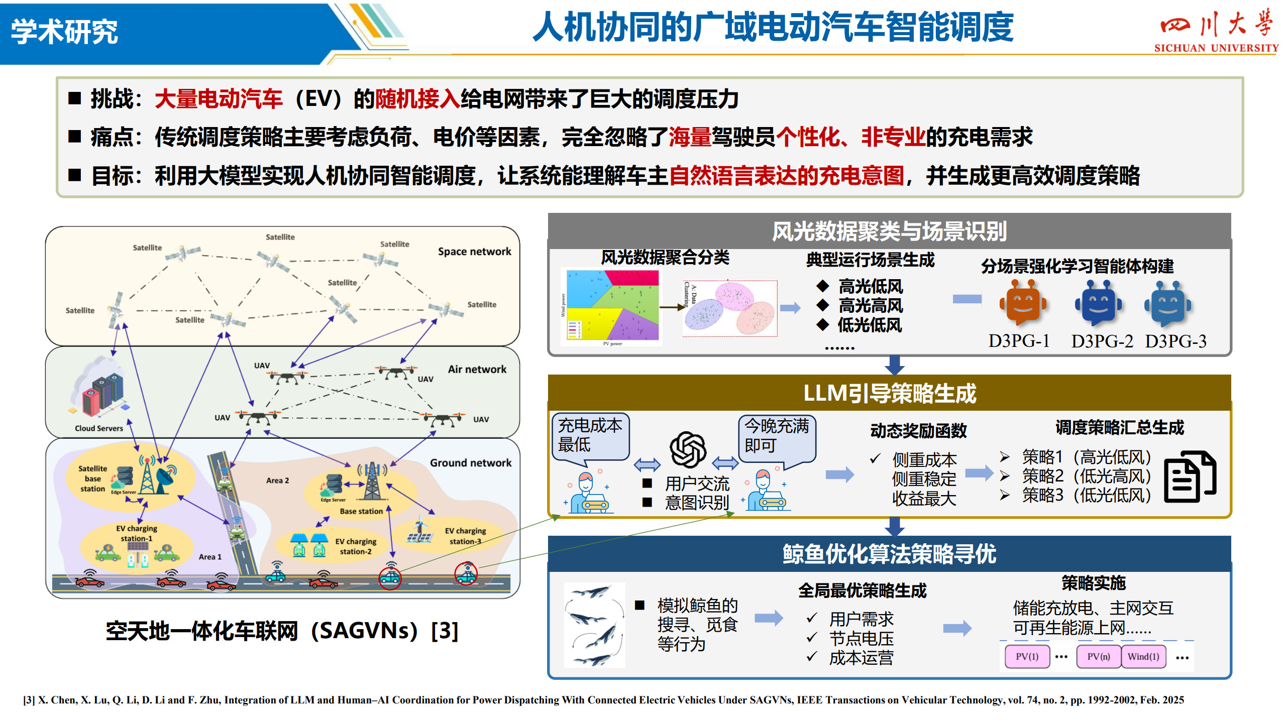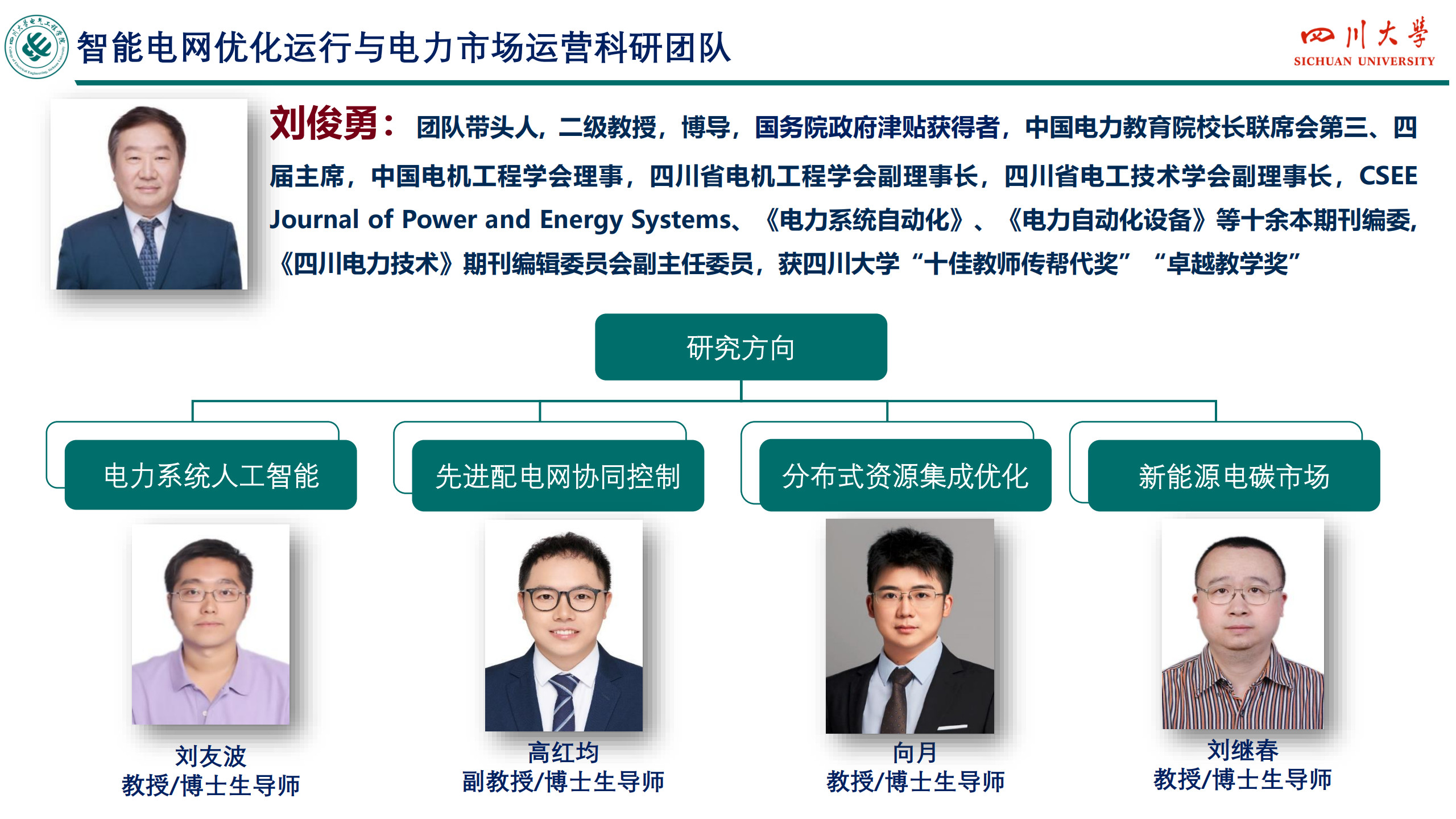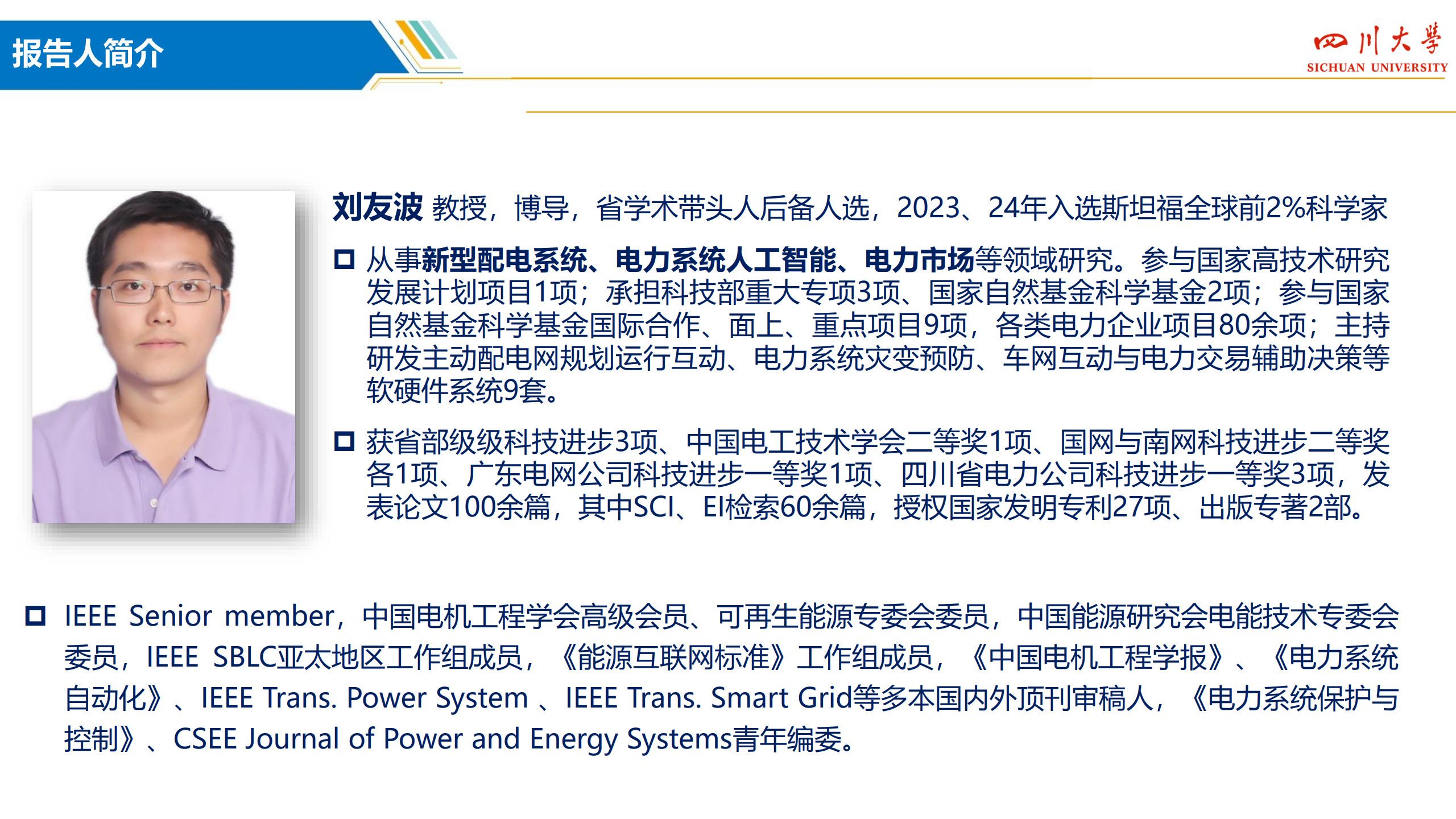 教授,博士生导师,IEEE Senior Member,省学术和技术带头人后备人选,入选“双百人才”工程,2023、24年连续入选“斯坦福全球前2%顶尖科学家”。从事电力系统人工智能、新型配电系统、新能源电力市场领域研究。国家重点研发计划课题负责人,承担国家重点研发计划、国家自然科学基金、四川省重大专项等国家级、省部级项目9项,各类电力横向课题80余项,到校经费6000余万元。获四川省、福建省科技进步奖3项,发表论文140余篇,获2024年IEEE电力技术专委会最佳论文奖。主持研发的电网稳定人工智能主动预防控制系统,利用人工智能解决传统计算场景单一、效率低下的弊端;主持研发新能源电网通道限额深度学习实时校核与优化系统,利用深度学习跟踪超大规模风电运行特性,提升大型电网新能源通道输电能力5~8%;主持研发风电机组视觉大模型协同运维装备,部署应用于8个风电场站,提升人力运检效率60%,有效压降停电时窗,经济效益明显,已进入稳步推广与升级阶段;主持研发居民电动汽车有序充电边缘智能管控终端,利用边缘智能技术,解决无序充电带来的电网容载不足、供需时空特性错配的问题,可在不进行基础扩建前提下,大幅提升局部电力汽车充电接装能力,被遴选为2025年5月西博会首批参展的电力人工智能产品。