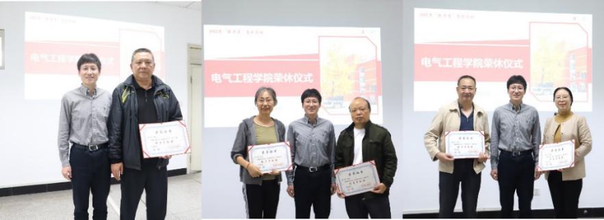 仪式上,赵昱辉书记代表学院和肖先勇院长向各位荣休教职工表示感谢和敬意,感谢各位荣休老师当年选择了电气大家庭,感谢他们为学院发展作出的贡献、打下的基础,感谢岁月的芳华为荣休老师们开启了人生新阶段。他说,电气学院是一本有厚度的书,每位教职工都是其中的一页,既书写着学院过去的历史,也续写着未来更加精彩的篇章,期待各位荣休老师能够一如既往地关心和支持学院的发展;电气学院也是一个有情怀的大家庭,每位教职工都是其中的一员,学院会用心用情用力做好服务保障工作,努力让各位感到更加安心暖心舒心;电气学院更是一个养人的宝地,祝福各位荣休老师们享受生活、身体健康、家庭幸福。